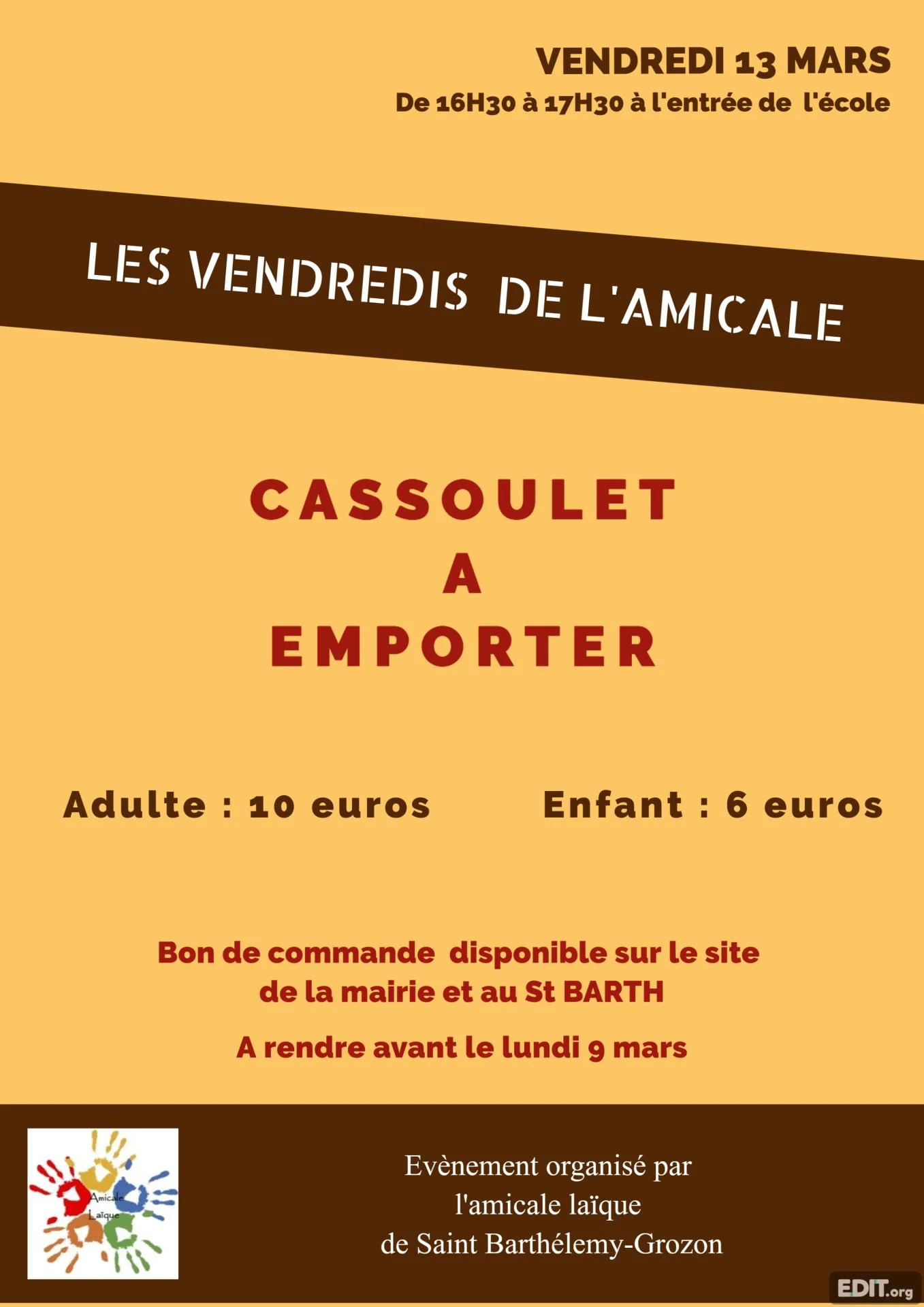 L'Amicale Laïque reconduit en 2026 le service de plats à emporter lancé l'an dernier avec succès. Vendredi 13 mars, nous vous proposons un cassoulet succulent! A venir chercher de 16h30 à 17h30, à la sortie de l’école.