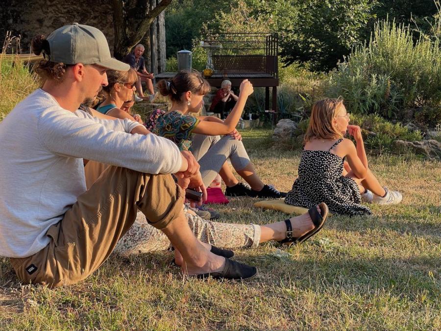La scène se passe jeudi 13 juillet 2022 dans la cour de l'ancienne école de Grozon, peu après l'inauguration et le vernissage, au Temple de Grozon, de l'Exposition de Peinture Magmas Désendormis: